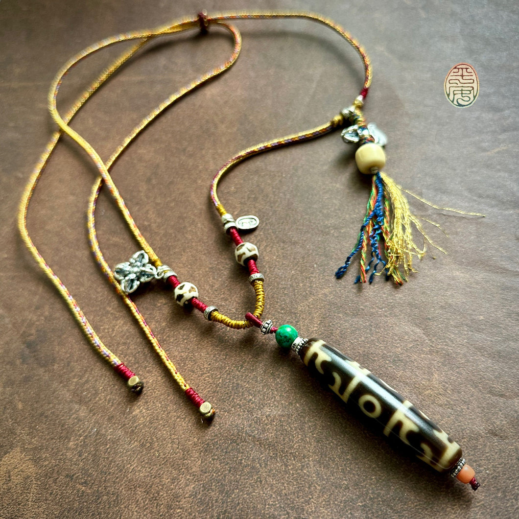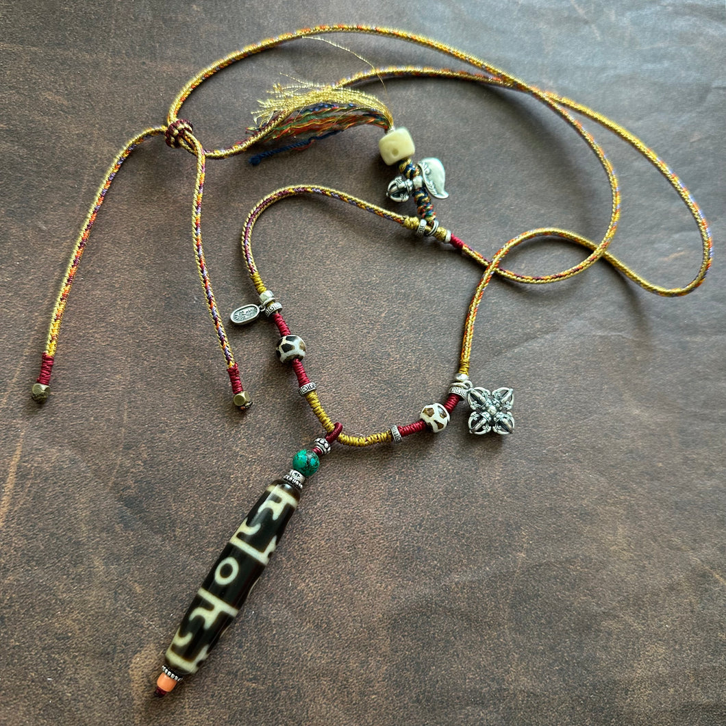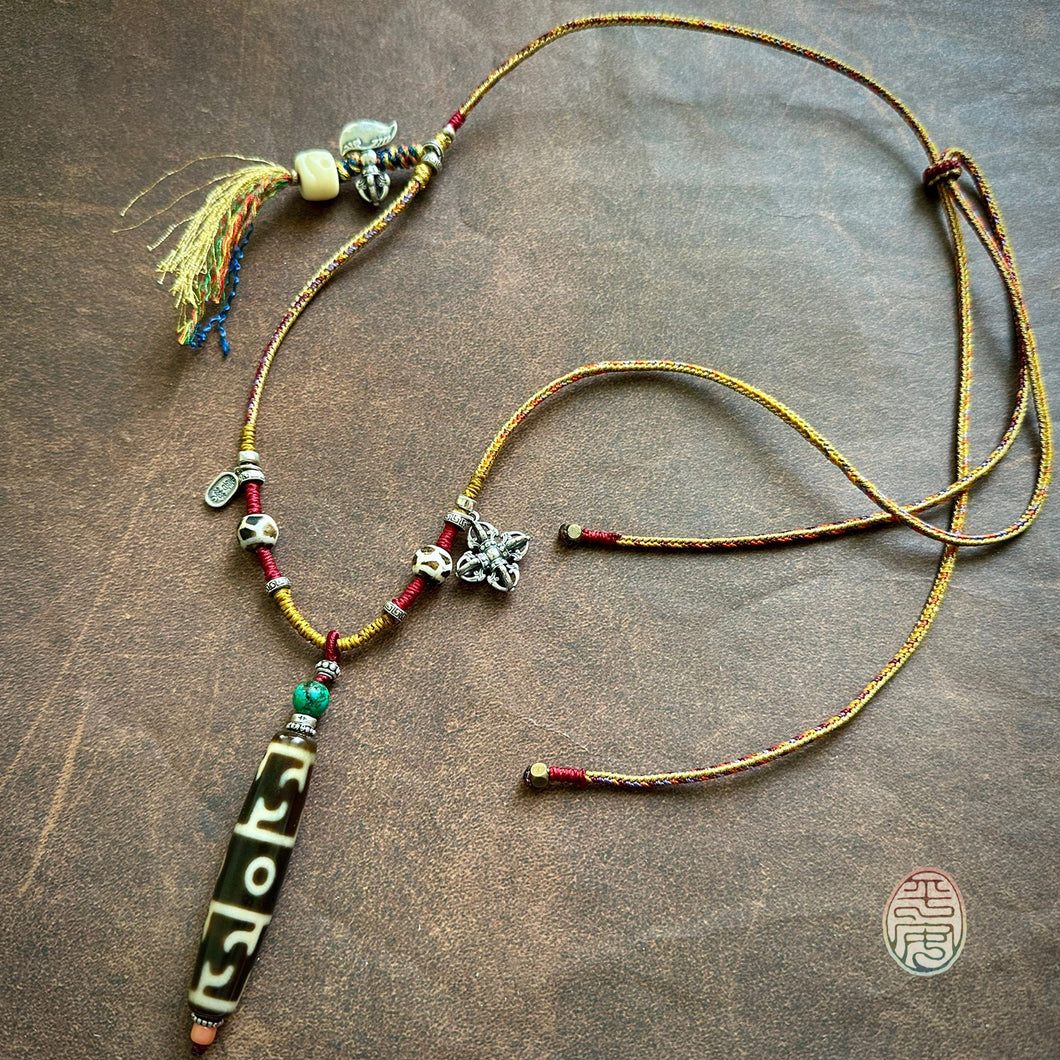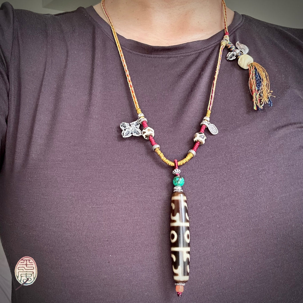 The design of this colorful dZi necklace is inspired by the traditional Tibetan style.