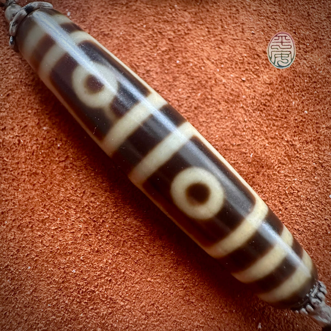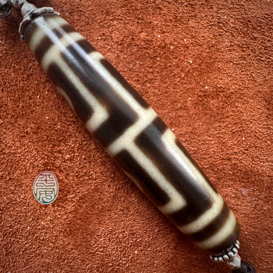 The dimensions of the dZi bead are 50 x 12 mm. This is a genuine vintage bead and shows slight natural marks and surface wear consistent with age. Over time, it has been carefully preserved, carrying the quiet strength and spiritual essence treasured in Tibetan Buddhist tradition. Please view the zoomed-in photos and video to appreciate its beautiful details.