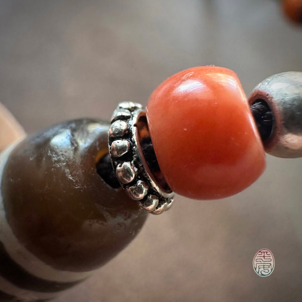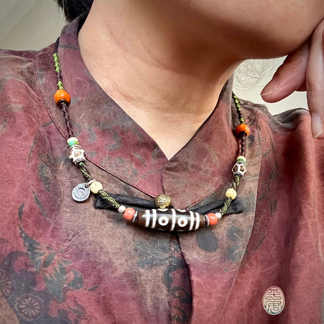 The dimensions of the dZi bead are 38 x 12 mm. This is a genuine vintage bead and shows slight natural marks and surface wear consistent with age. Over time, it has been carefully preserved, carrying the quiet strength and spiritual essence treasured in Tibetan Buddhist tradition. Other decoration beads include Tibetan read coral, ancient yak bone beads, and ancient Bondik beads.